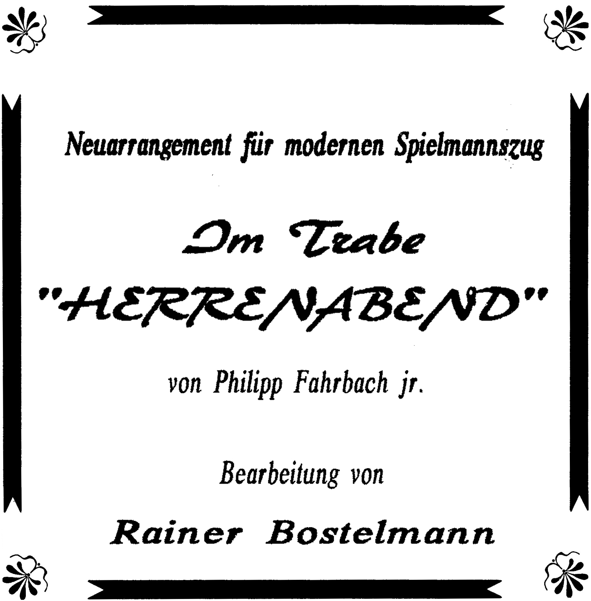 Im Trabe "Herrenabend" von Philipp Fahrbach jr. Ein typischer Trabmarsch in der majestätischen Pferdegangart Arrangement: Rainer Bostelmann Artikelnummer: 06000100 Preis: 37,00 €