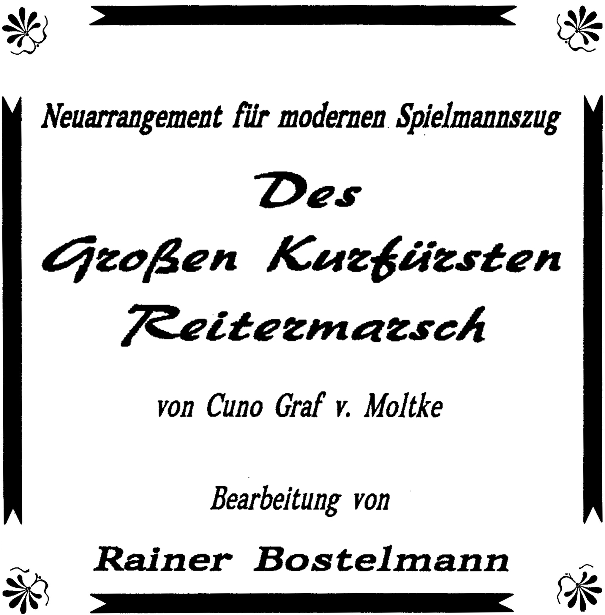 Des großen Kurfürsten Reitermarsch von Cuno Graf v. Moltke Solo für Trompete, Lyra oder Diskantflöte in freier Wahl. Arrangement: Rainer Bostelmann Artikelnummer: 06000400 Preis: 51,00 €
