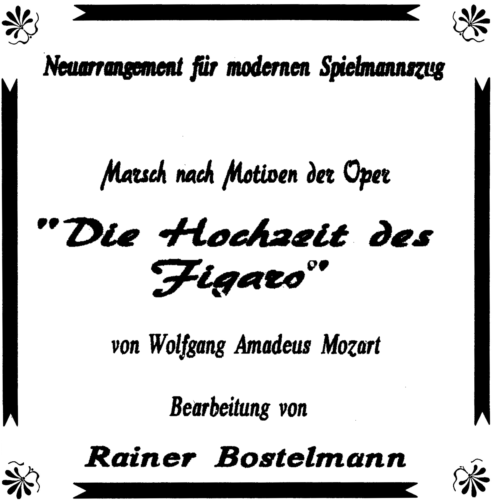 "Die Hochzeit des Figaro" von Wolfgang Amadeus Mozart Zwei Melodien der bekannten Oper im Marsch vereint. Arrangement: Rainer Bostelmann Artikelnummer: 06000300 Preis: 41,00 €